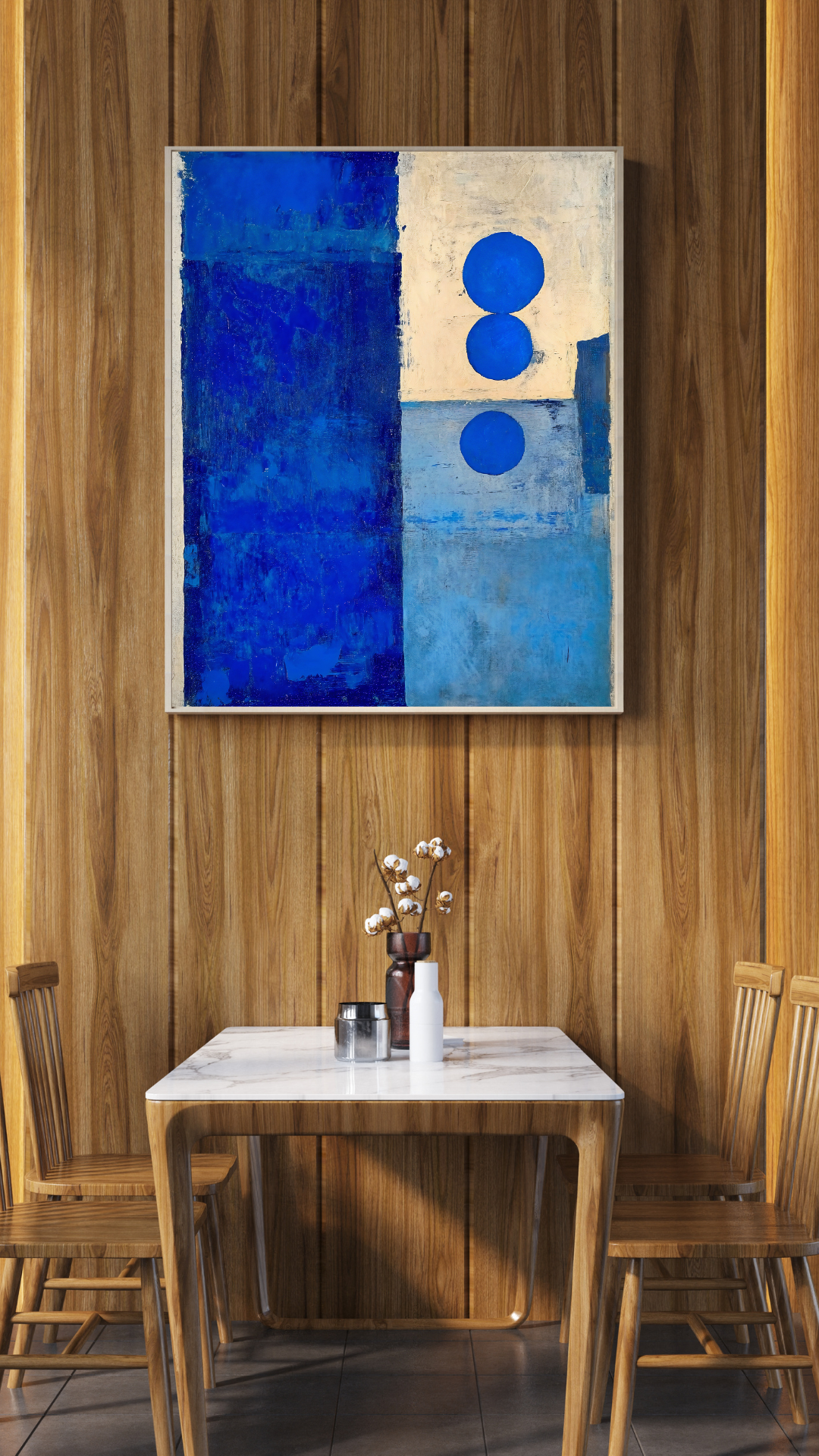 Pintura minimalista y abstracta inspirada en el diseño Wabi Sabi con texturas en capas, patrones orgánicos y color